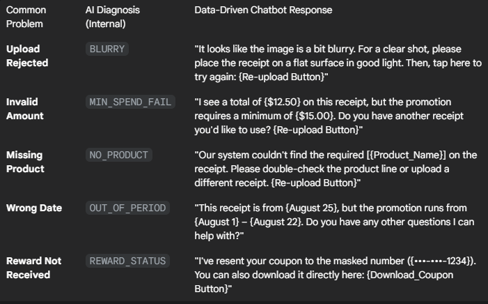 - Re-upload Success Rate: After chatbot guidance, users successfully re-upload a valid receipt 35% more often.